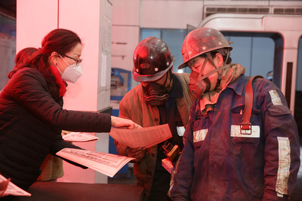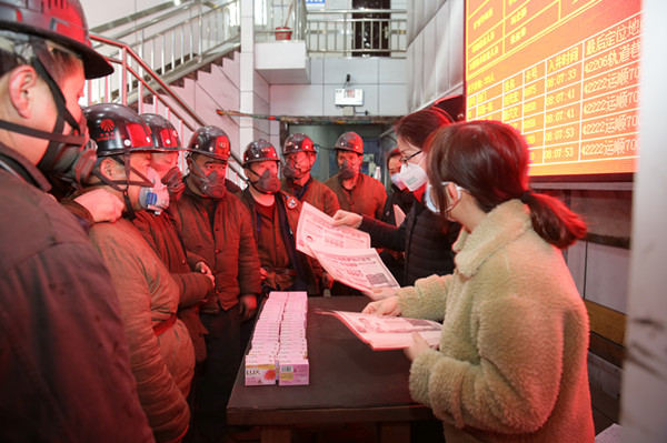 2月2日下午,在柴家溝井井口,該礦工會(huì)女工委組織女職工開展疫情防控宣傳活動(dòng)。