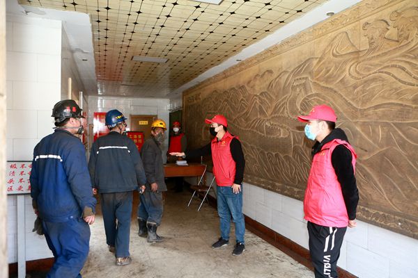 “師傅,您再往后面來一點,說話時要保持1.5米以上距離;工作期間請將口罩佩戴好?!惫茍F支部書記張君和青年團員來到井口,溫馨提示廣大職工積極做好個人防疫。