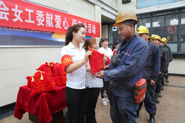 6月11日下午,陳家山煤礦工會女工委在井口開展“獻愛心 促安全”活動,為一線職工們送上精美的安全福袋和安全囑托。