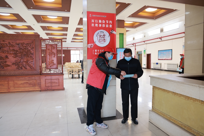“師傅,進入欣怡食苑等室內(nèi)公共場所請主動佩戴口罩,排隊打飯時請保持‘一米線’,謝謝您的積極配合。”青年志愿者王繼超在欣怡食苑門口溫馨提醒每位進入就餐的職工注意個人防護,將《預(yù)防呼吸道傳染病公眾佩戴口罩指引》發(fā)放給每個人手中,為沒戴口罩的職工發(fā)放一次性醫(yī)用口罩,耐心向大家解釋科學佩戴口罩對預(yù)防冬季呼吸道傳染病的重要意義。