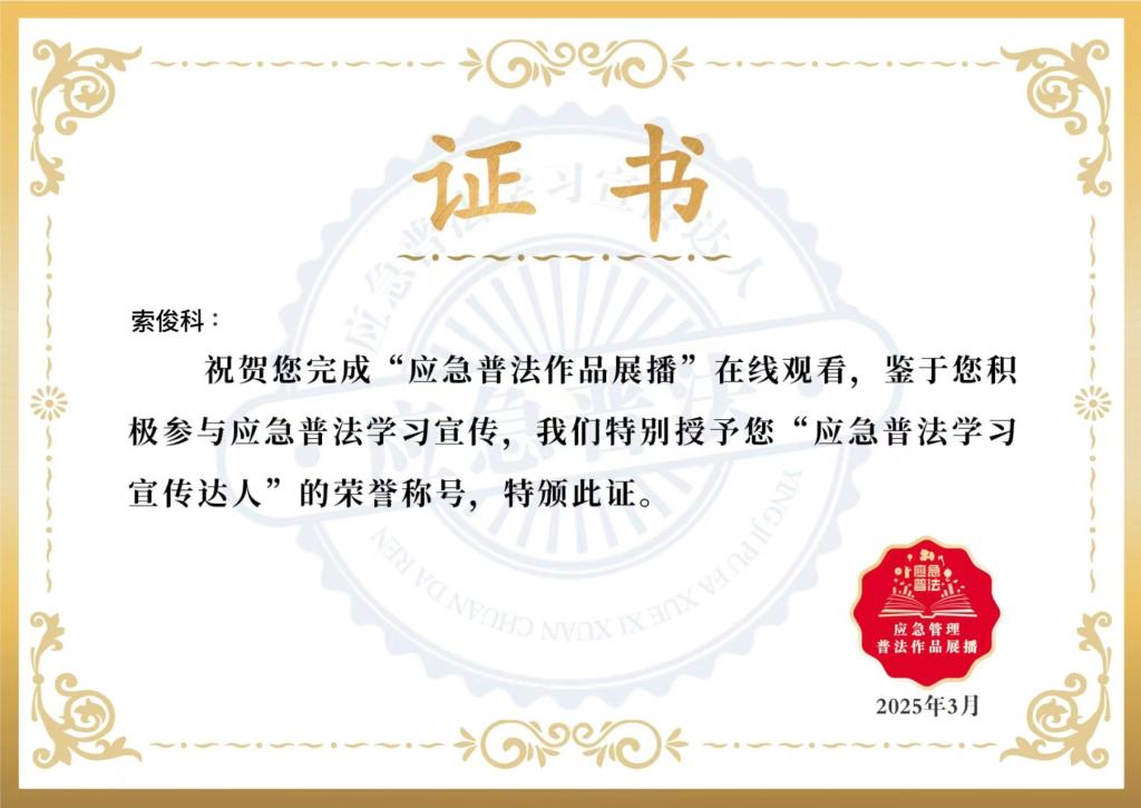 “學(xué)賽享”融合添活力,積分賦能掀熱潮。在活動(dòng)形式上,該項(xiàng)目部突破傳統(tǒng)模式,打造“學(xué)、賽、享”融合的創(chuàng)新矩陣。所屬各單位組織集體學(xué)習(xí)會(huì),結(jié)合展播作品開展案例研討,將法律條文轉(zhuǎn)化為生動(dòng)實(shí)踐;開展“普法達(dá)人”積分競(jìng)賽,營(yíng)造“比學(xué)趕超”的良好氛圍;鼓勵(lì)職工將普法作品轉(zhuǎn)發(fā)至親朋好友,形成“一人參與、全家受益”的輻射效應(yīng)。同時(shí),創(chuàng)新推出“積分兌換”機(jī)制,職工可通過累積積分兌換“應(yīng)急普法學(xué)習(xí)宣傳達(dá)人”電子結(jié)業(yè)證書,進(jìn)一步激發(fā)參與動(dòng)力。