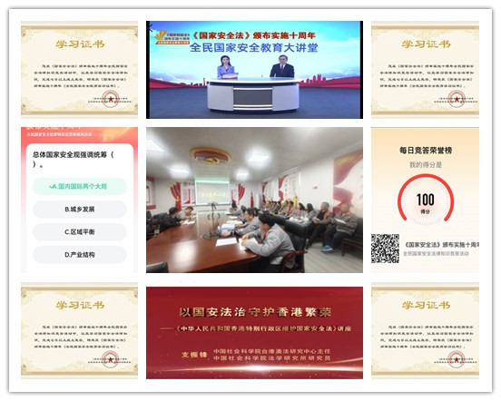 為深入學(xué)習(xí)領(lǐng)會習(xí)近平法治思想的重大意義、豐富內(nèi)涵、精神實(shí)質(zhì)和實(shí)踐要求,大力學(xué)習(xí)宣傳總體國家安全觀,該中心明確學(xué)習(xí)內(nèi)容,緊扣“全民國家安全教育 走深走實(shí)十周年”主題,圍繞總體國家安全觀有關(guān)內(nèi)容,以觀看講座、線上答題和朗讀相結(jié)合,引導(dǎo)廣大職工通過掃描活動二維碼,直接進(jìn)入答題環(huán)節(jié)參與只是競答和朗讀活動,堅持每日觀看一個講座片段、答一份競賽試題,堅持每日朗讀一個法條段落。全體參與活動人員均獲得《2025年全民國家安全教育學(xué)習(xí)證書》。