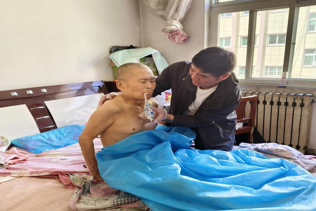 在這場(chǎng)愛心接力中,該中心運(yùn)行部長(zhǎng)劉小兵以真摯的情感和實(shí)際行動(dòng)成為最溫暖的“接力者”。他毫不猶豫地主動(dòng)承擔(dān)起照料重任,每天早早到李銀虎家中,為他洗漱、擦拭身體,準(zhǔn)備營(yíng)養(yǎng)早餐并耐心喂食;每隔一段時(shí)間為他翻身、按摩,預(yù)防臥床并發(fā)癥;工作間隙匆匆趕去陪他聊天讀報(bào),用歡聲笑語(yǔ)驅(qū)散孤獨(dú);夜晚安頓他休息后才離開。劉小兵的每一步都飽含溫情,每一個(gè)細(xì)節(jié)都彰顯初心。