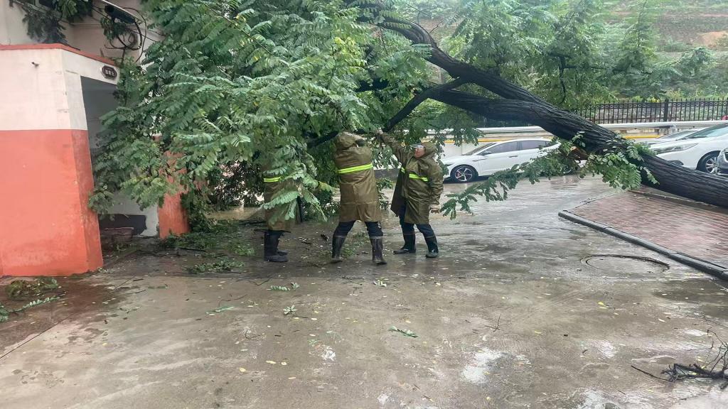 電鋸的轟鳴聲瞬間壓過了風雨聲,他們動作麻利地對倒伏的樹木進行分段切割。雨水和著汗水浸濕了他們的臉龐,泥漿沾滿了褲腿,但他們沒有絲毫懈怠。有人奮力拉扯繩索控制樹干倒向,有人仔細清理散落的枝葉,還有人迅速將截斷的木材搬運到指定地點。整個搶修過程緊張有序、忙而不亂,也展現(xiàn)了物業(yè)人員訓練有素的應急處理能力。