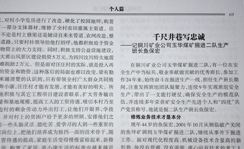 文章以《千尺井巷寫忠誠》為題,介紹了魚保宏同志作為礦井安全生產(chǎn)先進(jìn)個人和“四優(yōu)”共產(chǎn)黨員,從業(yè)24年來始終奮斗在掘進(jìn)生產(chǎn)一線,執(zhí)著追求理想,努力實現(xiàn)自身價值,擔(dān)任班組長期間,帶領(lǐng)班組連續(xù)9年實現(xiàn)安全生產(chǎn),帶出了一支能打硬仗,確保安全生產(chǎn)的模范隊伍的先進(jìn)事跡。