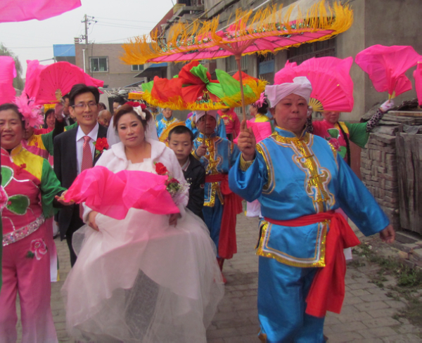 10月28日上午10時許,一隊由60多人組成的銅川市陜北秧歌藝術團的隊員們從北市區(qū)二馬路的加氣站出發(fā),迎著一對新人走向距離加氣站50米的原陜西省勞模、銅川礦務局三里洞煤礦退休職工趙全國家里。