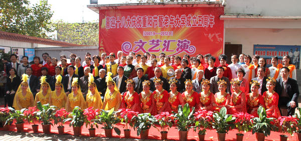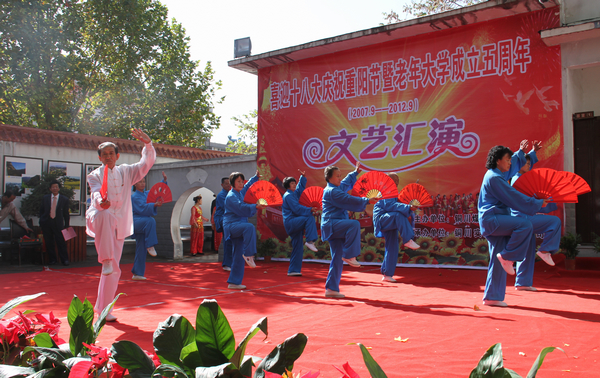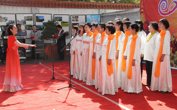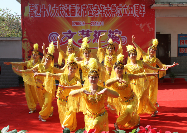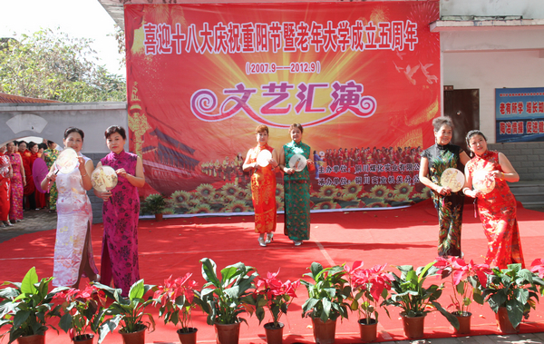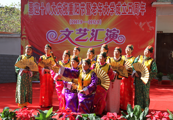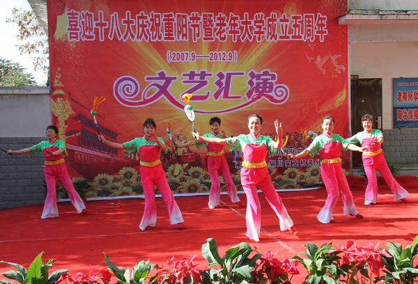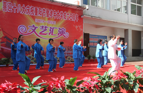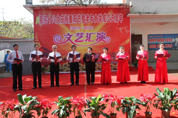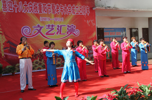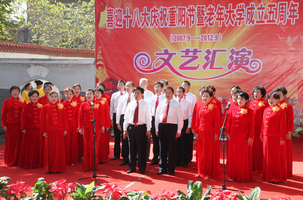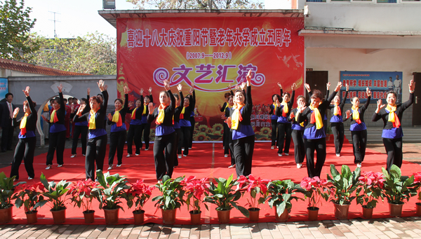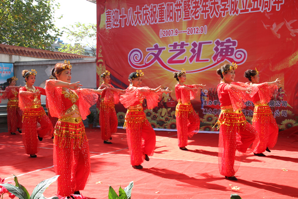 隨后,文藝匯演在大型舞蹈《廣場舞》曲中拉開帷幕。葫蘆絲《瑤族舞曲》、《軍港之夜》、舞蹈《故鄉(xiāng)是北京》、柔力球《為你跑成羅圈圈腿》、快板《九月九日穿紅衣》、《保健長壽食療歌》、二十四式太極拳、女聲獨(dú)唱《毛主席的話兒記心上》、詩歌朗誦、中華功夫扇、男聲獨(dú)唱《滾滾長江東逝水》、小合唱《重陽節(jié)快樂》、模特表演《家和萬事興》、大合唱《又唱瀏陽河》等節(jié)目,相繼登場亮相。演員們的精彩表演,博得全場觀眾陣陣熱烈的掌聲。
