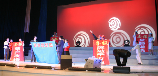 桃園社區(qū)的歡慶鑼鼓——《銅煤贊》揭開了演出的序幕。來自陜北綏德歌舞團的舞蹈《金嗩吶》,展示了黃土高原青年男女對幸福生活的向往和追求;民歌手雒潔演唱的陜北民歌《三十里鋪》,聲情并茂,仿佛把我們帶到了黃土高原那片遼闊的土地;我省秦腔名家李小峰的清唱《打柴勸弟》、《三滴血》激昂、高亢,唱功名不虛傳,不斷贏來熱烈的掌聲。由我國著名演員劉遠(yuǎn)、蔣瑞征表演的小品《辦公室的故事》,歌頌了我局領(lǐng)導(dǎo)一心為民、替民分憂的公仆精神。由著名相聲表演藝術(shù)家侯耀文的關(guān)門弟子魏元成、趙魏明合說的相聲《樓上樓下》,語言幽默,詼諧,令人捧腹;陜西歌舞團的著名歌唱家仵曉蘭演唱的歌曲《感恩》、《兒行千里》抒發(fā)了母親對兒子的那份牽掛和兒子時刻牢記母親的養(yǎng)育之恩,他滿含深情的演唱感動了在場所有的觀眾。