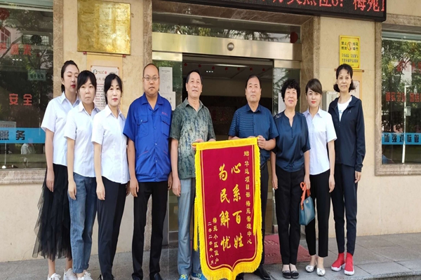 8月24日一大早,緊張有序的工作剛剛開(kāi)始,梅苑中心客戶服務(wù)大廳來(lái)了兩位特殊的客人,他們是小區(qū)的住戶代表,特地為梅苑中心送來(lái)一幅“為民解憂 心系百姓”的錦旗,為近期梅苑中心為廣大住戶做的努力表示感謝。