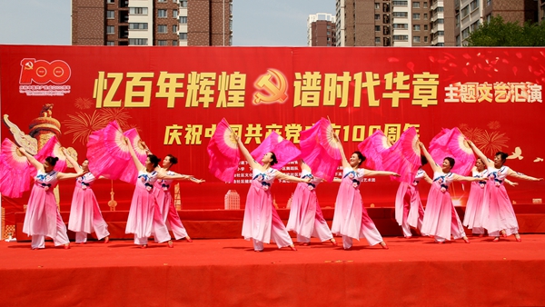 文藝演出在社區(qū)舞之緣舞蹈隊帶來的熱情洋溢的紗巾舞《燦爛的陽光下》中拉開序幕。腰鼓《東方紅》鏗鏘的鼓點、激昂的旋律,歡樂的氣氛,贊頌了建黨百年的輝煌歷程;女聲獨唱《我的祖國》,激昂有力的歌聲表達(dá)了對黨的無限熱愛。