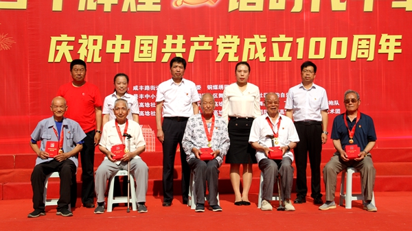 演出開始前,特別舉行了慶祝建黨100周年“光榮在黨50年紀(jì)念章”頒獎典禮,為下高埝社區(qū)黨委的7名老黨員頒發(fā)了“光榮在黨50年紀(jì)念章”。一枚枚紀(jì)念章,熠熠生輝,意義非凡,是半個世紀(jì)以來老黨員始終堅定信念跟黨走,一路艱苦奮斗、披荊斬棘的榮耀追溯,也凝聚著黨和人民對老黨員的敬仰之情。