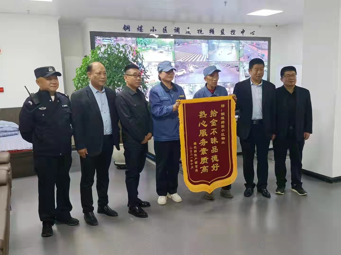 10月9日上午,銅川市民陳先生將一面寫有“拾金不昧品德好 熱心服務(wù)素質(zhì)高”的大紅錦旗送到銅煤繡園物業(yè)綜合辦公室,對該小區(qū)保潔員黃萬明撿到裝有萬元現(xiàn)金等物的提包主動(dòng)歸還失主的好品德表示由衷地感謝。