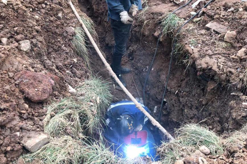 該中心負(fù)責(zé)人隨即帶領(lǐng)搶險隊員趕赴現(xiàn)場,在進(jìn)行現(xiàn)場查勘巡檢后,發(fā)現(xiàn)柴家溝井1號蓄水壩旁綠化帶內(nèi)有水流沖刷痕跡,位置與供水管路重合,判定為供水管道破裂漏水。為了減少停水對職工群眾日常生活影響,該中心負(fù)責(zé)人組織人員分頭行動,一組人員在家屬區(qū)張貼欄張貼停水通知,在微信群內(nèi)公告停水原因及如何做好冬季防凍,最大限度降低停水對職工群眾帶來的困擾;另一組人員負(fù)責(zé)設(shè)置警戒,調(diào)配小型挖掘機(jī)、鐵锨、洋鎬等設(shè)備工具,連夜對漏水管路進(jìn)行搶修。礦區(qū)冬季的夜晚寒風(fēng)刺骨,搶險隊員們手中的鐵锨和洋鎬不停的揮舞,汗氣與哈氣交織在一起,干累了就換人,人停工具不停;人停機(jī)械不停。