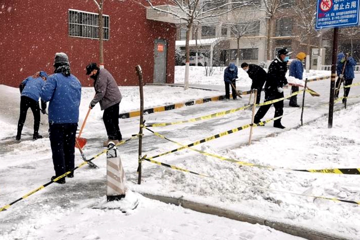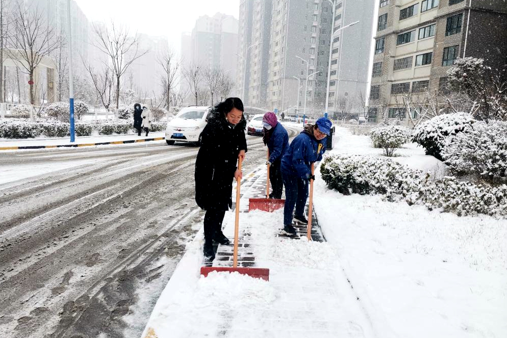 1月20日晚上,安保及管理人員連夜對(duì)主要通道路面進(jìn)行撒鹽處理。1月21日清晨6點(diǎn),天還未亮,雪還未停,“先遣隊(duì)”已開始掃雪開路。早上7點(diǎn),保安、保潔、工程、綠化及領(lǐng)導(dǎo)干部全班上陣,員工們的臉和手都凍紅了,但是都沒有一聲抱怨,依然不畏嚴(yán)寒,齊心協(xié)力,躬著身子,握著推板鐵鍬,哈著白氣一鏟一掃的把雪推到路旁,道路上演奏著“咣咣咔咔嚓嚓”鏟雪進(jìn)行曲,忙碌的身影形成了一道亮麗的風(fēng)景線。