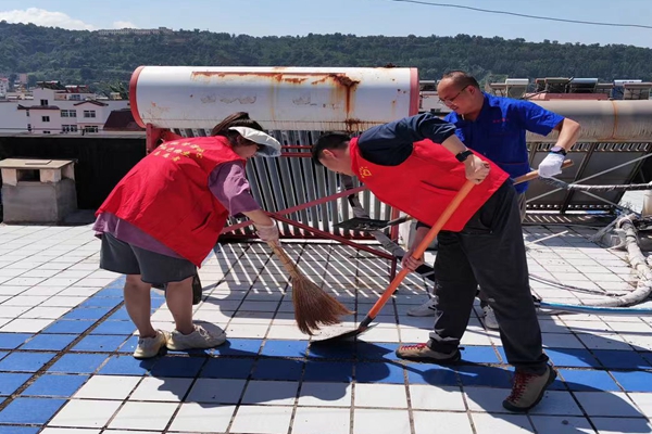 每天早上8點30分,該中心全體人員準時在物業(yè)大廳集合,大家戴著手套、拿著編織袋,一起出發(fā),對排查有需要清理雜物的樓棟進行整治,那些被丟棄的雜物被連搬帶抬的從樓上搬運了下來,看著被收拾的利利索索的樓道及樓頂,大家感覺再熱再累也是值得的。