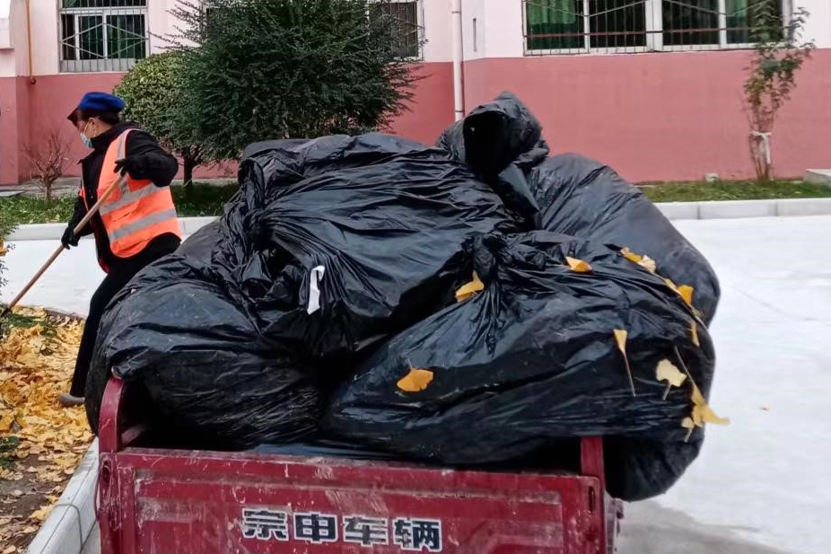 為給小區(qū)住戶營造一個良好的居住環(huán)境,保證道路的干凈整潔,該中心秩序維護綠化保潔部人員加大普掃落葉強度,采用人工清掃、裝袋清運、電動三輪車拉運的方式對小區(qū)路面落葉進行清掃。