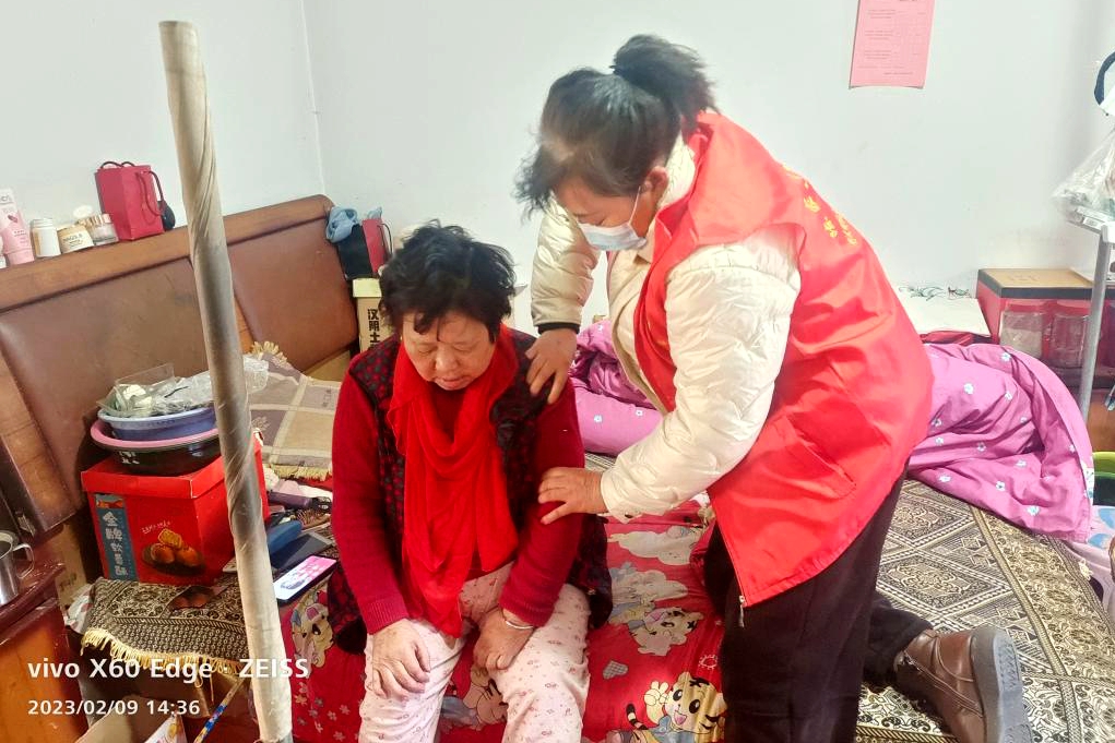 “你們來了,快進、請坐”。曹雪芳高興的跟志愿者招呼到,志愿者問候道“最近身體怎么樣,有沒有什么不舒服……”曹雪芳患有腦梗,導致半身不遂,老伴腿腳不好,兒女常年不在身邊,生活很是困難,志愿者每隔兩天就來看望她一下,給她做做按摩、陪她曬太陽、聊天,講解當前的惠民政策、洗衣做飯等志愿服務,解決了她家的實際問題,使他們真實的感受到社區(qū)大家庭的關懷與溫暖。