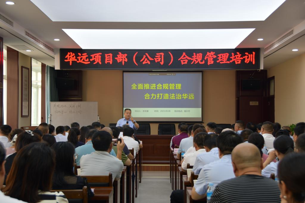 今年是銅川市合規(guī)管理強化年,9月8日,華遠(yuǎn)項目部以“全面推進(jìn)合規(guī)管理、合力打造法制華遠(yuǎn)”為主題,在梅樂園舉辦合規(guī)管理培訓(xùn)會,該項目部相關(guān)領(lǐng)導(dǎo)、部門負(fù)責(zé)人和所屬單位行政負(fù)責(zé)人及綜合、財務(wù)、運行部負(fù)責(zé)人共計九十余人參加了培訓(xùn)。