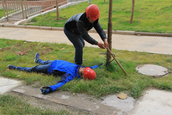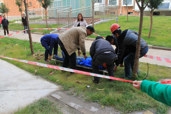 為了增強(qiáng)演練的真實(shí)性,該社區(qū)在前期進(jìn)行了周密的策劃。主要?jiǎng)澐譃樗膫€(gè)組展開演練,警戒組、救援組、事故調(diào)查組、人員疏通組,并配備了演練所需相關(guān)設(shè)備。演練開始,小區(qū)內(nèi)一名施工人員不小心踩到破皮電線導(dǎo)致觸電當(dāng)場昏厥,同行同事第一時(shí)間向社區(qū)應(yīng)急領(lǐng)導(dǎo)小組電話報(bào)告,并切斷電源用木棍挑開漏電電線,隨即趕來的警戒組拉起警戒線,并疏散圍觀人員,救援組撥打120,并對急救人員進(jìn)行現(xiàn)場人工呼吸級(jí)及心肺復(fù)蘇急救,等待救護(hù)車的到來,最后事故調(diào)查組對事故產(chǎn)生的原因進(jìn)行調(diào)查、拍照、取樣,作詳細(xì)記錄,并向應(yīng)急領(lǐng)導(dǎo)小組匯報(bào)事故處理情況。