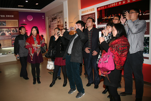采風(fēng)團(tuán)一行首先參觀了銅煤文化展覽館。面對(duì)氣勢(shì)恢宏的《礦工萬歲》雕塑、陽(yáng)光燦爛的“礦工笑臉墻” 他們深感震撼、驚嘆不已。意蘊(yùn)深刻的《銅煤賦》不僅生動(dòng)體現(xiàn)了礦工的精氣神,準(zhǔn)確表達(dá)了銅川礦區(qū)的變遷史,使銅煤人“艱苦奮斗、銳意進(jìn)取,淡泊名利、無私奉獻(xiàn),勇于創(chuàng)新、繼往開來”的精神氣韻得到完美詮釋,更是博得這些文人墨客的高度贊譽(yù)。通過觀看展示銅煤半個(gè)多世紀(jì)輝煌歷程的專題片《百里銅煤耀華夏》,以及展示銅川礦區(qū)煤層賦存的地理圖志、生物化石、典籍史料和反映企業(yè)歷史沿革、艱苦創(chuàng)業(yè)的老照片、珍貴實(shí)物,采風(fēng)團(tuán)一行對(duì)銅川礦業(yè)公司有了更深的認(rèn)識(shí),對(duì)陜煤化集團(tuán)有了更深的理解。