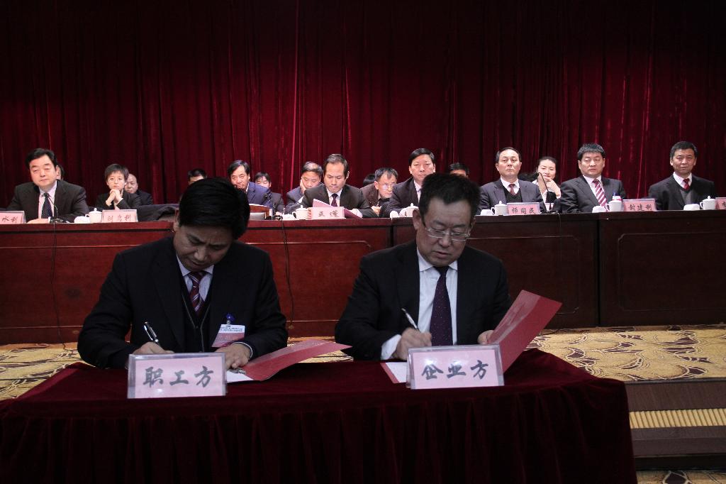 下午的大會由公司副總經(jīng)理劉水利主持。會上,企業(yè)方代表與職工方代表簽訂了公司2014年《工資集體合同》,通報了民主測評公司領(lǐng)導(dǎo)班子和領(lǐng)導(dǎo)人員結(jié)果,通過了大會決議。