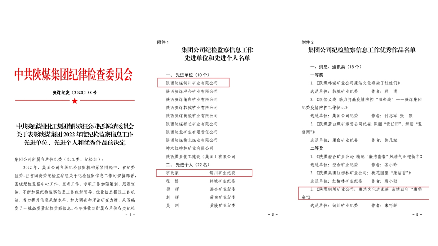 近日,陜煤集團(tuán)紀(jì)委印發(fā)《關(guān)于表彰2022年度紀(jì)檢監(jiān)察信息工作先進(jìn)單位、先進(jìn)個(gè)人和優(yōu)秀作品的決定》,公司被評為“紀(jì)檢監(jiān)察信息工作先進(jìn)單位”,1名紀(jì)檢同志被評為先進(jìn)個(gè)人。由公司紀(jì)委報(bào)送的《陜煤銅川礦業(yè)公司:廉潔文化進(jìn)家庭 親情助守“廉堡壘”》《陜煤銅川礦業(yè)柴家溝井:在推進(jìn)廉潔文化中鎖定目標(biāo)找準(zhǔn)奮進(jìn)坐標(biāo)》分別榮獲消息類、通訊類二、三等獎(jiǎng)。