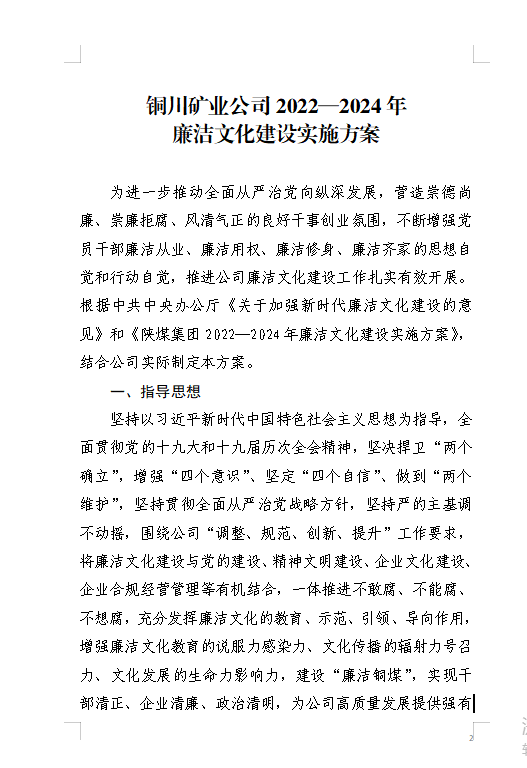 關于印發(fā)《銅川礦業(yè)公司2022—2024年廉潔文化建設實施方案》的通知