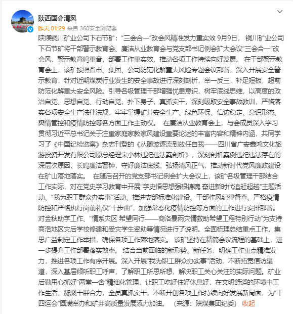 在隨后召開的黨支部書記例會擴大會議上,該礦各級管理干部結合工作實際,對在黨史學習教育中開展“學史悟思想強根鑄魂 奮進新時代追趕超越”主題活動、“我為職工群眾辦實事”活動、推進支部標準化建設、干部作風紀律督查、嚴格疫情防控和嚴格執(zhí)行崗前禮儀“十步曲”,加強常態(tài)化疫情防控等方面的工作進行安排部署。對金秋助學工作、“情系災區(qū) 希望同行——商洛暴雨災情救助希望工程特別行動”為支持商洛地區(qū)災后學校修建和受災學生資助等情況進行了說明。全面梳理總結重點工作,集思廣益制定工作舉措,確保各項工作落地落實。 該礦堅持在精簡會議流程的基礎上,進一步提升工作部署落實效率。