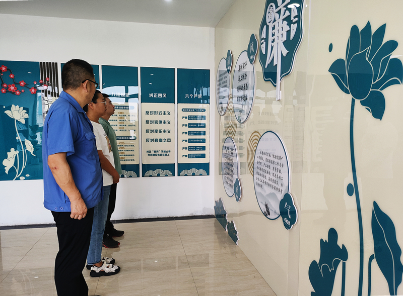 沿著長(zhǎng)廊繼續(xù)往里走,一幅幅包含“自律準(zhǔn)則、八項(xiàng)規(guī)定、糾正四風(fēng)、六個(gè)嚴(yán)禁”的清正廉潔牌板,美觀清新的“青蓮”圖案設(shè)計(jì),簡(jiǎn)約凝練的“清風(fēng)正氣”文字渲染,猶如美麗的畫卷徐徐展開,吸引著干部職工駐足觀看,使廉政文化入眼、入腦、入心,從而達(dá)到潛移默化、潤(rùn)物無聲的思想滲透,筑牢“不敢腐、不能腐、不想腐”的廉潔“防火墻”。