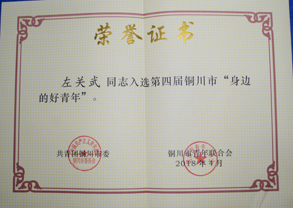 近日,從銅川市開展的青年大學(xué)習(xí)“不忘初心 牢記使命”主題團(tuán)日活動中傳來喜訊,公司物資供應(yīng)分公司團(tuán)委榮獲“銅川市五四紅旗團(tuán)委”稱號,欣榮公司周軍同志被評為“銅川市優(yōu)秀共青團(tuán)干部”、公司信訪處左關(guān)武同志被評為第四屆銅川市“身邊的好青年”。