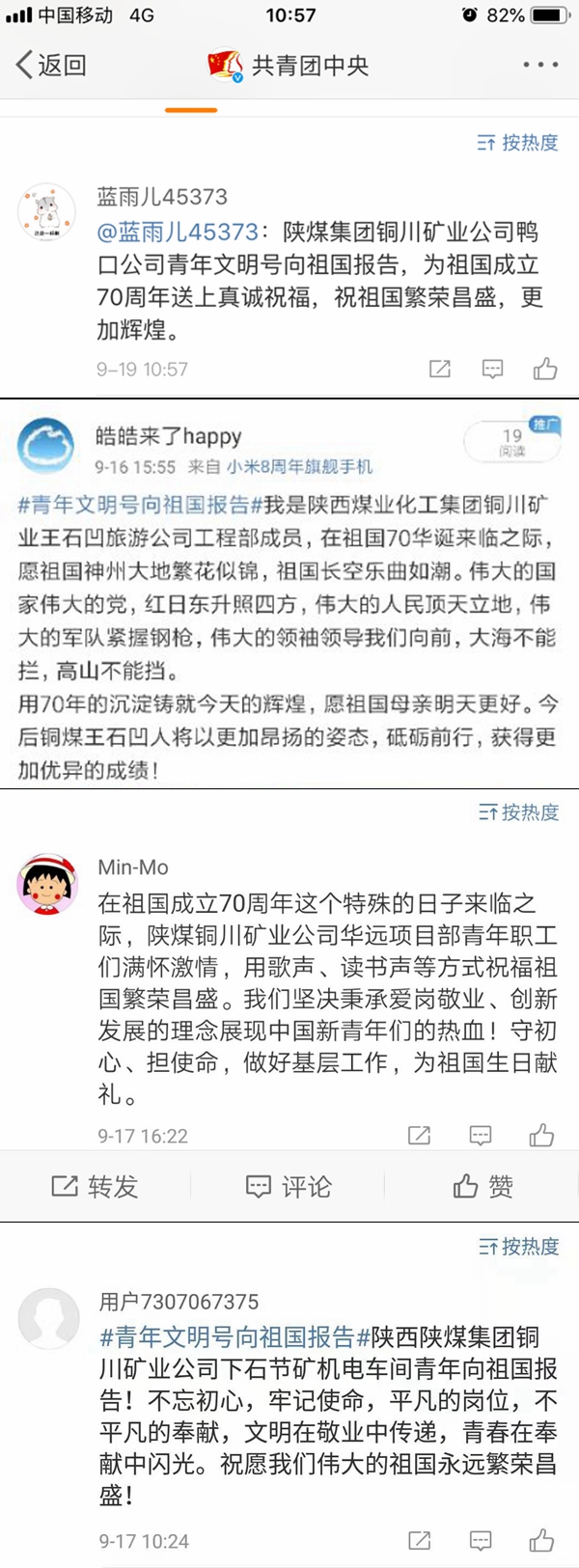 “祝愿祖國母親繁榮昌盛、走向輝煌!我們將努力奮斗、錘煉本領(lǐng),讓青春閃耀煤海。銅煤青年向祖國報告!”