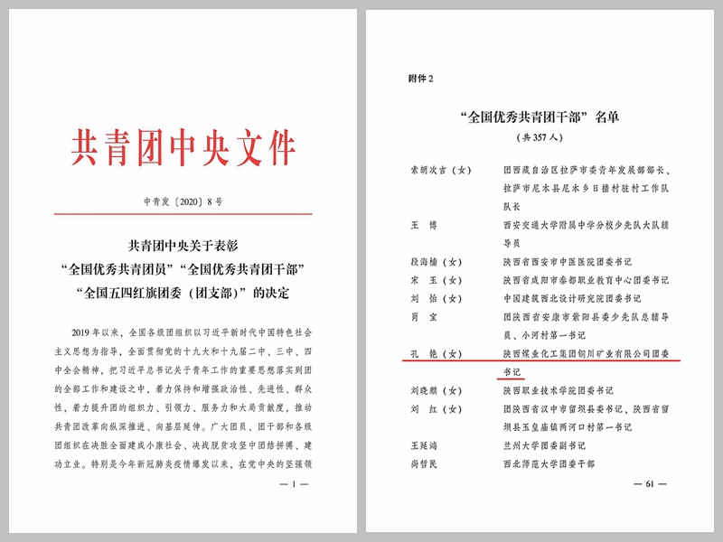 5月4日,團(tuán)中央發(fā)出《關(guān)于表彰“全國優(yōu)秀共青團(tuán)員”“全國優(yōu)秀共青團(tuán)干部”“全國五四紅旗團(tuán)委(團(tuán)支部)”的決定》,公司團(tuán)委書記孔艷同志被授予“全國優(yōu)秀共青團(tuán)干部”榮譽(yù)稱號(hào)。該獎(jiǎng)項(xiàng)是團(tuán)中央授予共青團(tuán)干部的最高榮譽(yù),全國共有357人獲此殊榮。孔艷同志是陜西省國資委系統(tǒng)中唯一獲此稱號(hào)的團(tuán)干部。