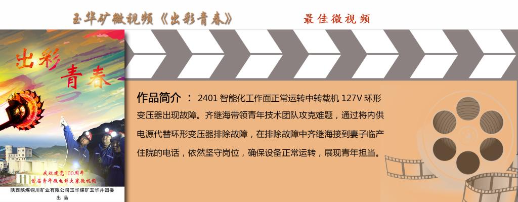 微視頻《出彩青春》生動(dòng)講述了玉華礦2401智能化工作面轉(zhuǎn)載機(jī)127V環(huán)形變壓器出現(xiàn)故障后,綜采隊(duì)隊(duì)長(zhǎng)齊繼海帶領(lǐng)青年技術(shù)團(tuán)隊(duì)現(xiàn)場(chǎng)排查處理,故障排除中齊繼海接到妻子臨產(chǎn)住院電話后,依然堅(jiān)守崗位,完成任務(wù),確保設(shè)備正常運(yùn)轉(zhuǎn)的故事,生動(dòng)展示了礦井優(yōu)秀青年崗位建功、舍小家顧大家的情懷擔(dān)當(dāng),獲得了“最佳微視頻”。