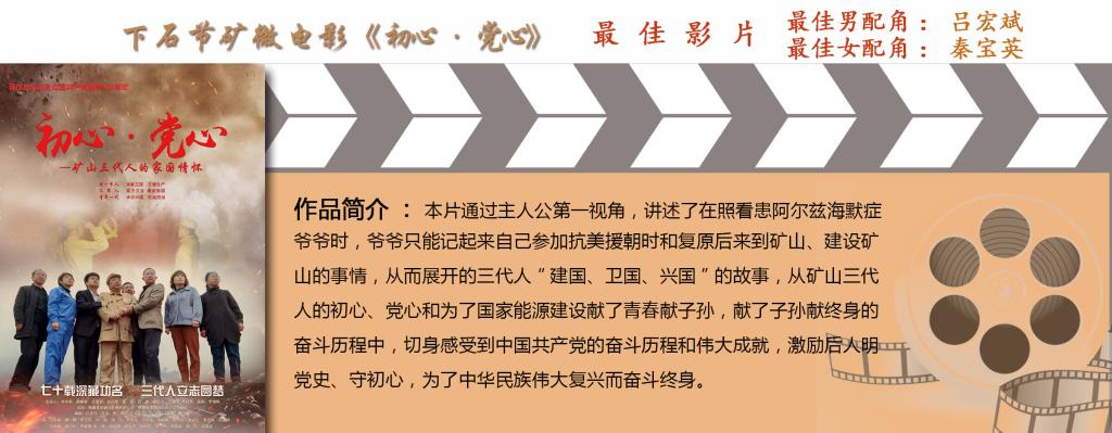 其中微電影《初心·黨心》以銅川礦區(qū)礦工三代奉獻(xiàn)礦山的事跡為創(chuàng)作背景,圍繞傳承紅色基因,賡續(xù)精神血脈,通過對(duì)礦山三代人家國(guó)情懷的生動(dòng)展示,深刻詮釋了銅煤人以初心鑒黨心,薪火相傳、奮斗創(chuàng)業(yè)的堅(jiān)定信仰和獻(xiàn)了青春獻(xiàn)子孫,獻(xiàn)了子孫獻(xiàn)終身的感人事跡。該作品憑借題材創(chuàng)意新穎、故事內(nèi)容感人、質(zhì)量效果上乘,一舉奪得“最佳影片”“最佳男配角”“最佳女配角”三項(xiàng)大獎(jiǎng)。