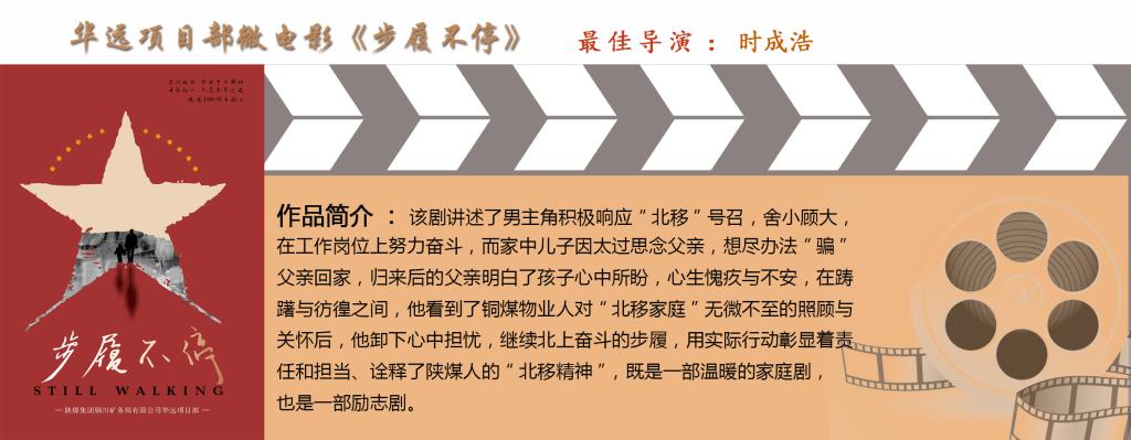 華遠(yuǎn)項(xiàng)目部微電影《步履不?!窚厍閯?lì)志,通過趙明理與兒子之間的精神羈絆、兒子與父親的斗智斗勇,以及趙明理與老同學(xué)的敘舊、感懷,體現(xiàn)出銅煤外出創(chuàng)業(yè)人無私無畏、一往無前的責(zé)任擔(dān)當(dāng),榮獲“最佳導(dǎo)演”獎(jiǎng)。