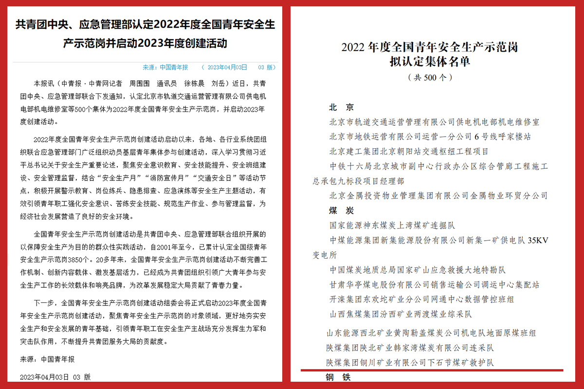 近日,共青團(tuán)中央、應(yīng)急管理部聯(lián)合下發(fā)《關(guān)于認(rèn)定2022年度全國(guó)青年安全生產(chǎn)示范崗的通知》,公司下石節(jié)礦救護(hù)隊(duì)獲評(píng)全國(guó)青年安全生產(chǎn)示范崗稱(chēng)號(hào)。此次評(píng)定500家單位中,陜西省共有19個(gè)集體獲此殊榮,其中煤炭行業(yè)2個(gè),公司下石節(jié)礦救護(hù)隊(duì)作為其中之一光榮上榜。