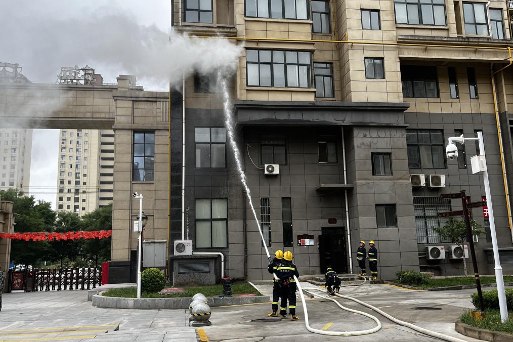 此次演練模擬巡邏人員發(fā)現(xiàn)梅樂園小區(qū)2號樓3層商鋪,出現(xiàn)“火情”,立即用對講機通知中控室值班人員,啟動消防應(yīng)急搶險預(yù)案,并撥打119報警電話。同時警戒組、安撫組、搶險組等趕赴地點開展救援工作,搶險組引導(dǎo)消防車至著火點,警戒組成員開展現(xiàn)場警戒工作,安撫組通過疏散樓梯引導(dǎo)住戶疏散逃生,搶險組攜帶毛巾、擔(dān)架等物品在一層樓道口幫扶老年人及行動不便居民疏散,統(tǒng)一撤至南廣場安全地帶,演練結(jié)束。
